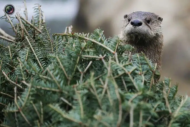 Речная выдра ищет корм среди выброшенных ёлок в зоопарке в Нью-Бедфорде, штат Массачусетс, США.