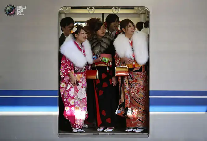 Японки в кимоно едут в метро после церемонии в День совершеннолетия в Токио.