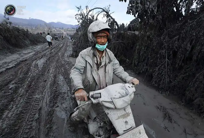 Сельский житель эвакуируется из деревни Бекера, недалеко от которой извергается вулкан Синабунг, в округе Каро, Индонезия.