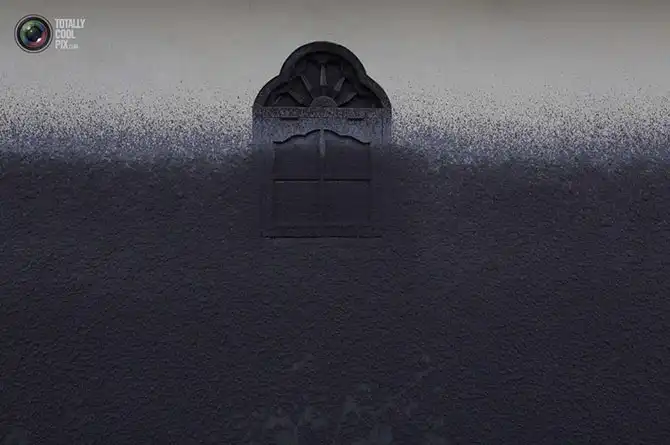 Пепел вулкана Синабунг на стене дома в деревне Бекера, Индонезия.