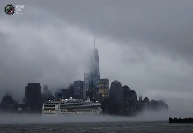 Круизное судно плывёт по реке Гудзон. Вид из Хобокена, штат Нью-Джерси.