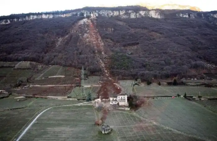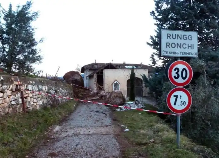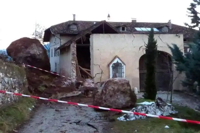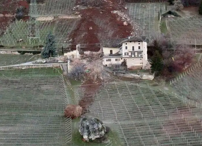 В итальянской провинции Южный Тироль огромный камень откололся от горы и покатился прямиком на дом. К счастью, пострадавших нет. Огромное везение в том, что булыжник остановился совсем рядом с ЛЭП.