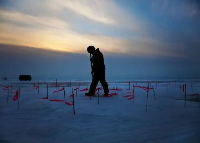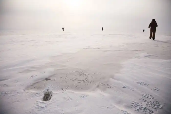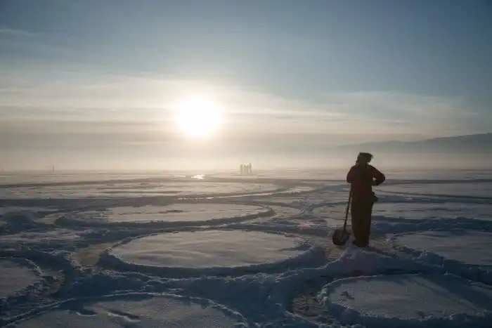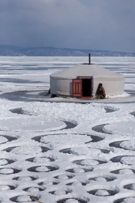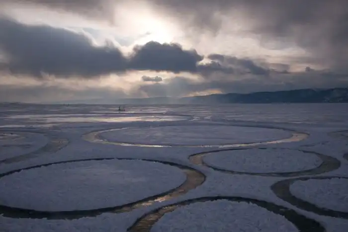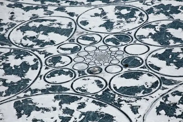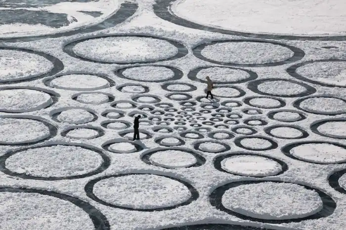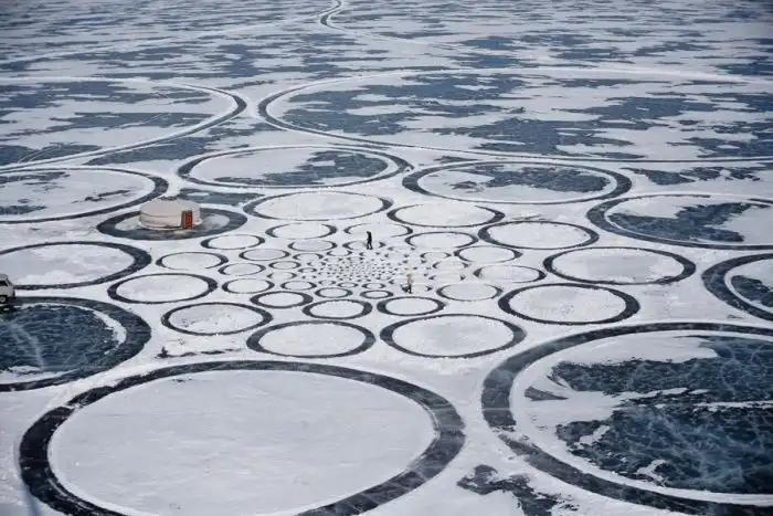 С первого взгляда может показаться, что это снова инопланетяне совершили вторжение на нашу землю, но нет... Это искусство! Весь этот "шедевр" был создан в 2010 году художником по имени Jim Denevan, при помощи его команды. Они проделали колоссальную работу, нарисовав эти пейзажи на льду озера Байкал.