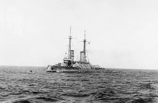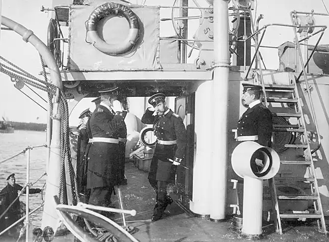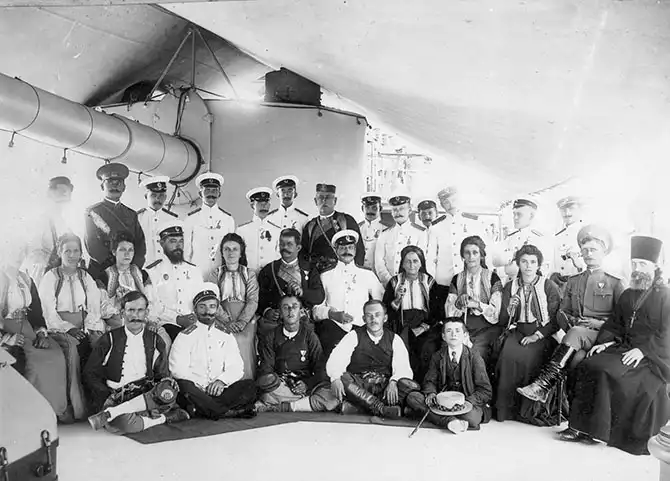 На борту броненосного крейсера «Адмирал Макаров» в порту Антивари в августе 1910 г. по случаю посещения корабля королем Черногории Николаем I