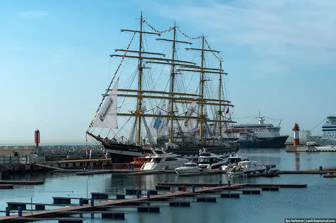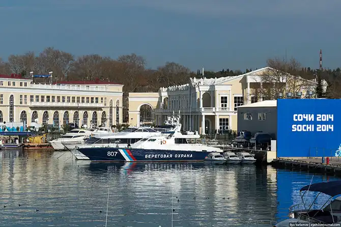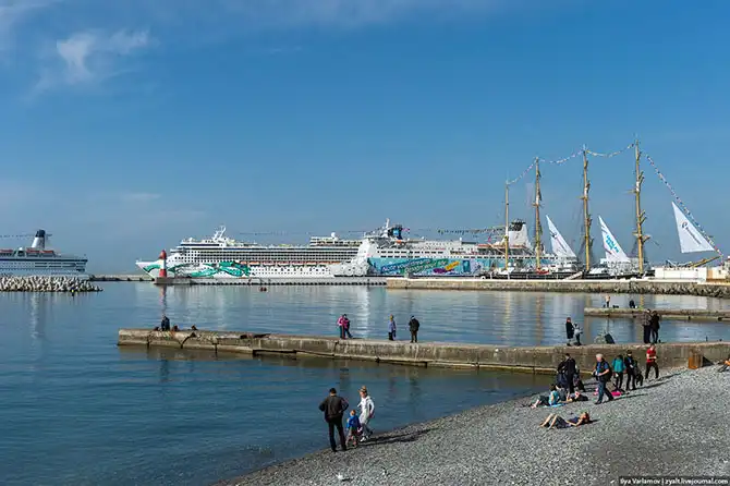 В Сочи пригнали круизные лайнеры, где живут гости Олимпиады. Море градусов 16, некоторые смельчаки купаются.