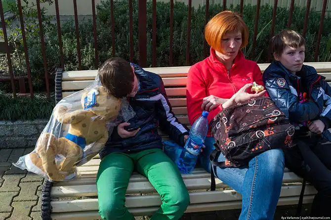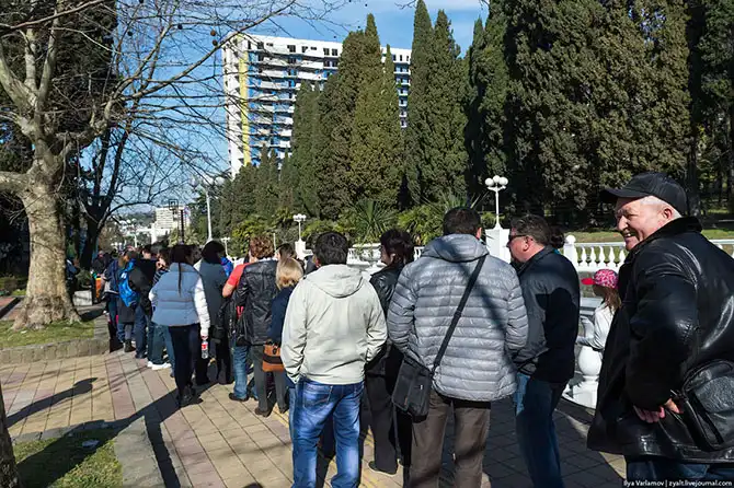 А эта очередь за паспортом болельщика. Тоже стоят часами. Лучше получать на вокзале Адлера. Еще лучше все оформить в интернете, будет быстрее. Почему я отнес эту очередь в «хорошее»? Ну просто приятно, что столько людей хотят на Олимпиаду попасть). Все эти рассказы про пустые трибуны – вранье. Я был и видел, какой ажиотаж. Билетов не достать.