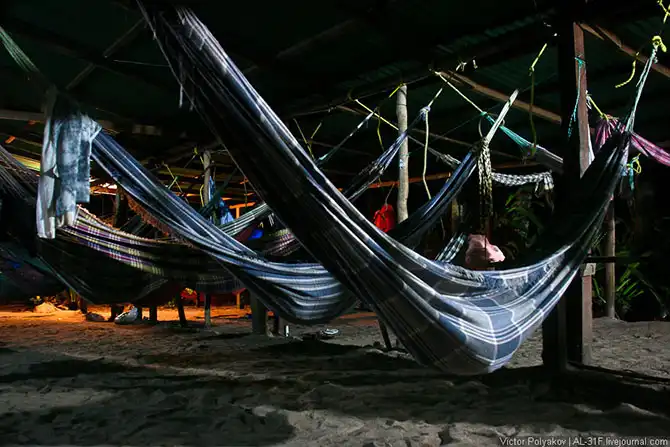 В пять вечера лодка переправила нас на другой берег реки, где был ужин и навес от дождя. Под навесом натянуты гамаки. Это наш дом до утра.