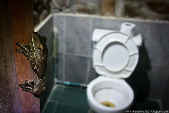 Темнеет в джунглях еще быстрее, чем в городе. Из развлечений – только сон в гамаке. Перед сном решил сходить в туалет. Аккуратно подошел к отдельно стоящему домику, в котором на удивление были ватер клозеты, включил фонарик, и чуть не «сходил», не дойдя полметра. На дверной коробке сидела лягушка. Всё бы ничего, но постарайтесь представить себе (или сходите до ближайшей двери и потрогайте) дверную коробку и размеры лягушки. Точно такая же недовольно смотрела на меня с самой двери.