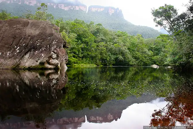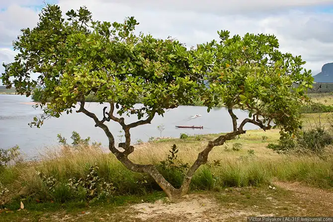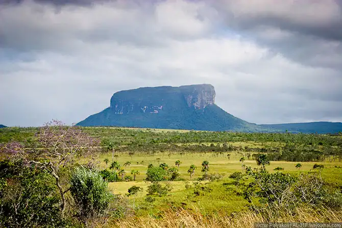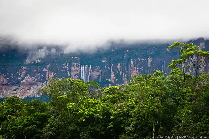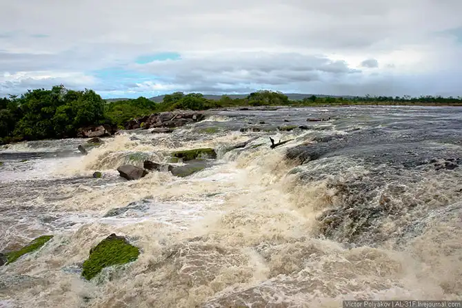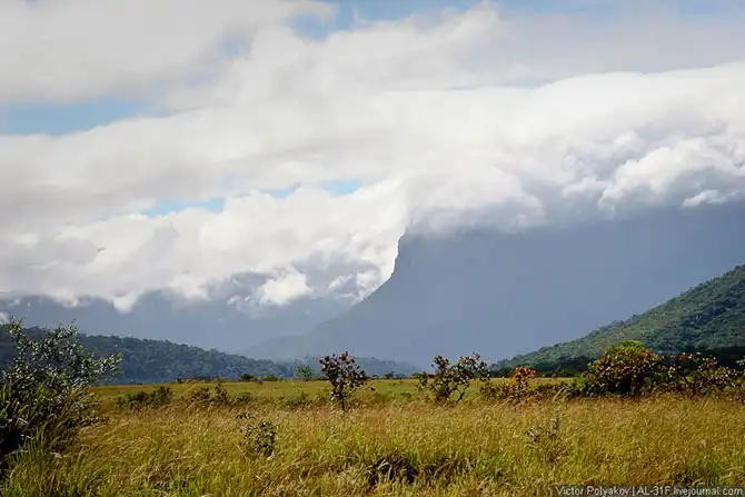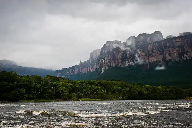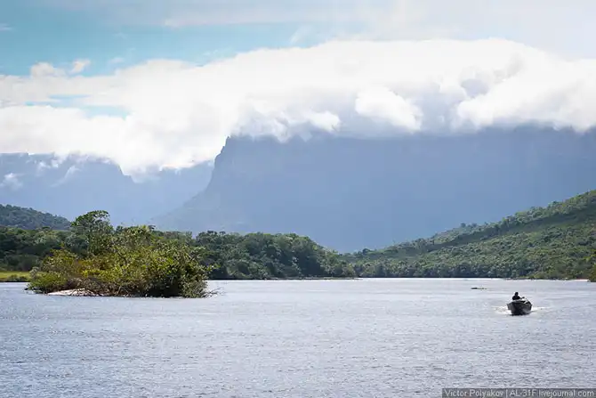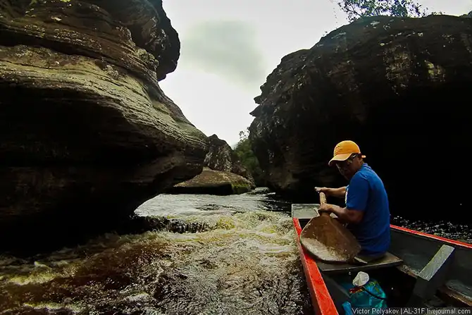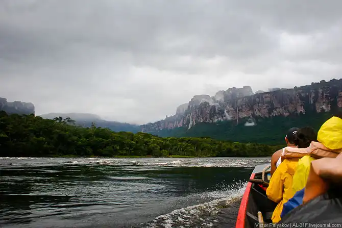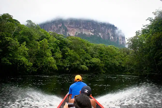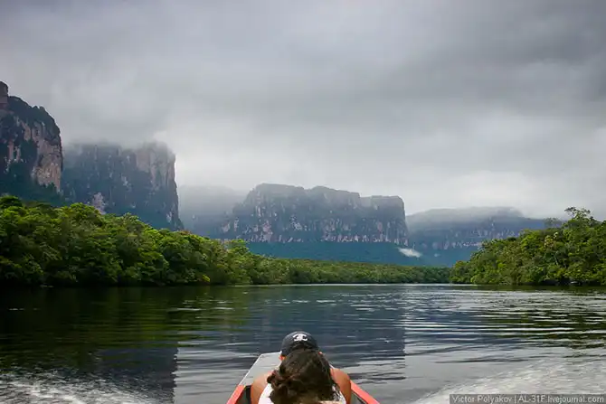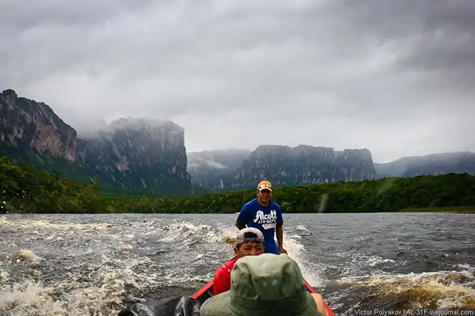 Где-то три с половиной часа мы шли вверх по течению, саванна потихоньку сменялась джунглями, а по бокам возвышались отвесные стены тепуёв.
