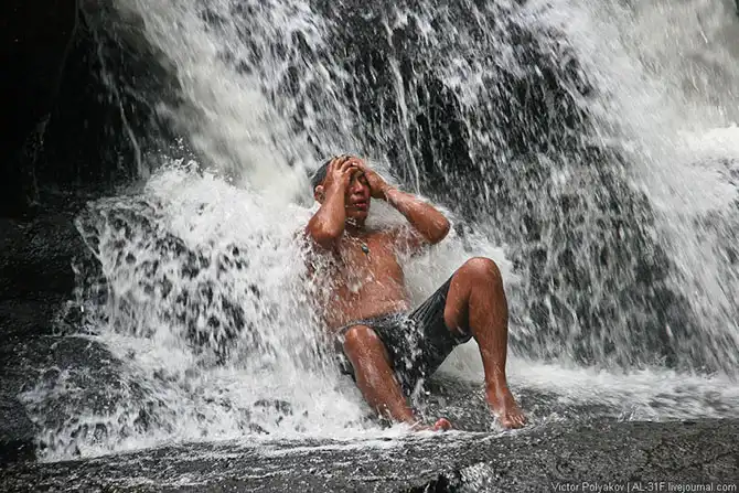Вот, например, наш гид Чурун моется в водопаде. Как положено – с мылом и шампунем. Согласитесь, ведь в лагере в душе совсем не то