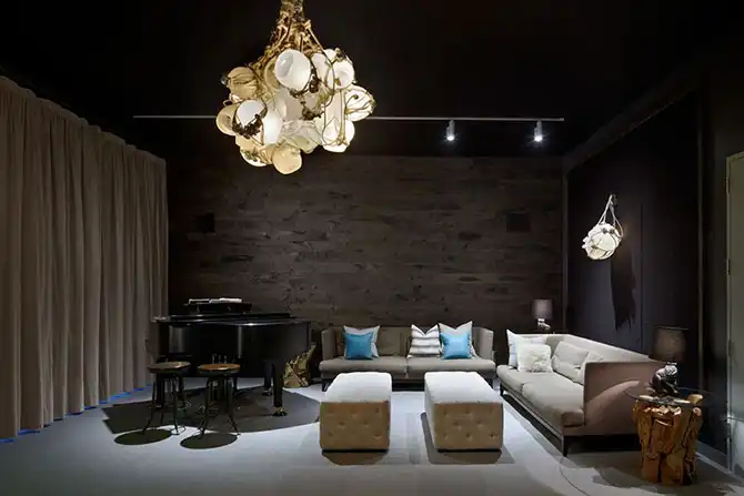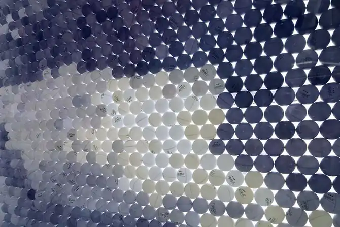 Самыми примечательными деталями дизайна можно назвать текстильную инсталляцию в столовой, похожую на украшение из нарезанной бумаги, а также мобильную перегородку, выложенную из разноцветных шариков для пинг-понга. Она имитирует увеличенную географическую карту.