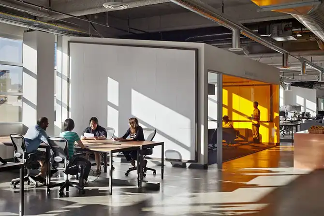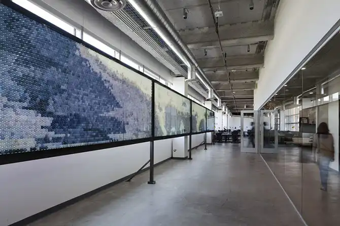 Американская компания Dropbox переехала в новый офис площадью 6500 кв. м, который находится в реконструированном промышленном здании. Дизайнеры не могли обойти тему бывшей функциональной принадлежности интерьера: во всех помещениях офиса выставлены на всеобщее обозрения воздуховоды и другие элементы коммуникаций, а конструктивные детали постройки не зашиты декоративными перегородками и не упрятаны внутрь аккуратных колонн.