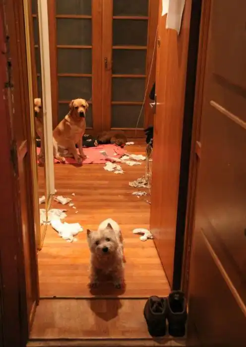 Автор этих фотографий явно не ожидал увидеть такой картины по возвращению домой с работы. Дело в том, что парень завел себе 7-ми месячного щенка лабрадора, который решил навести "порядок" в новом доме.