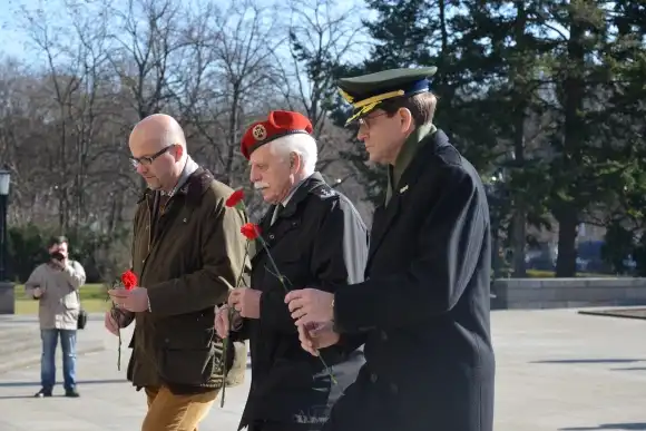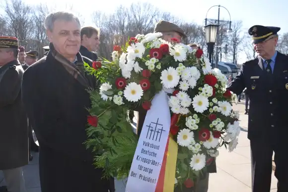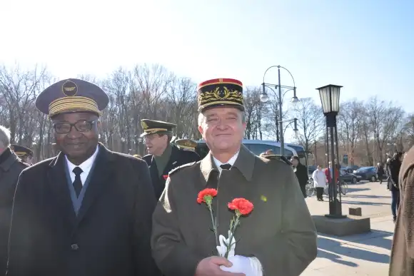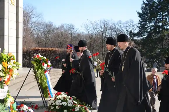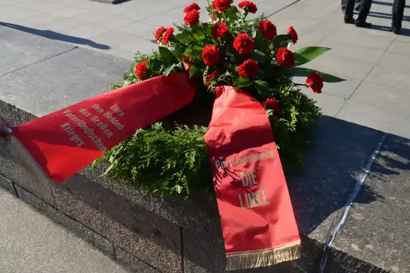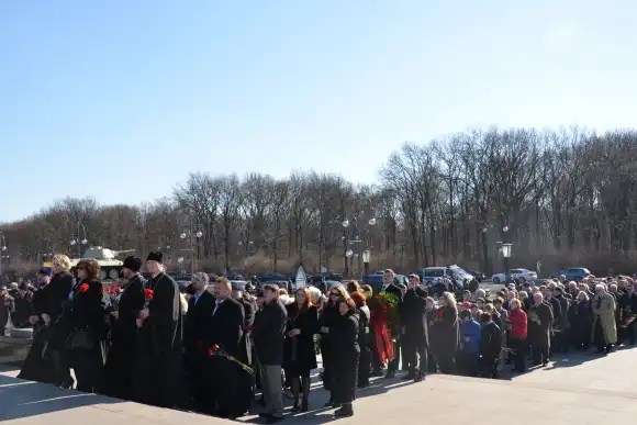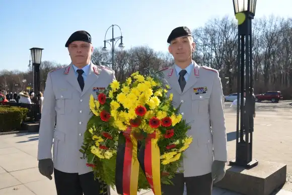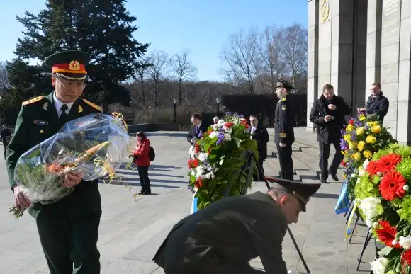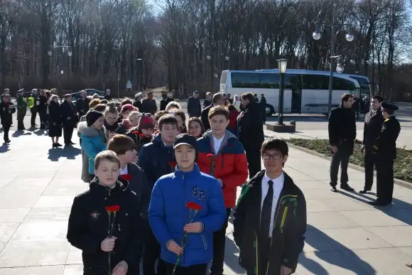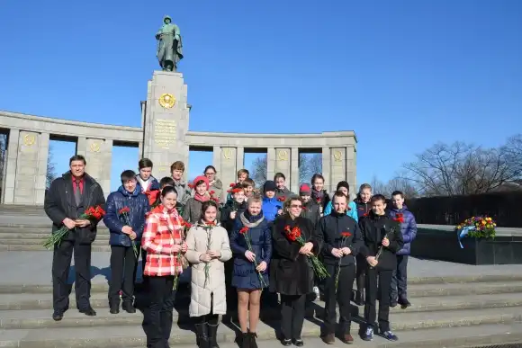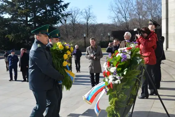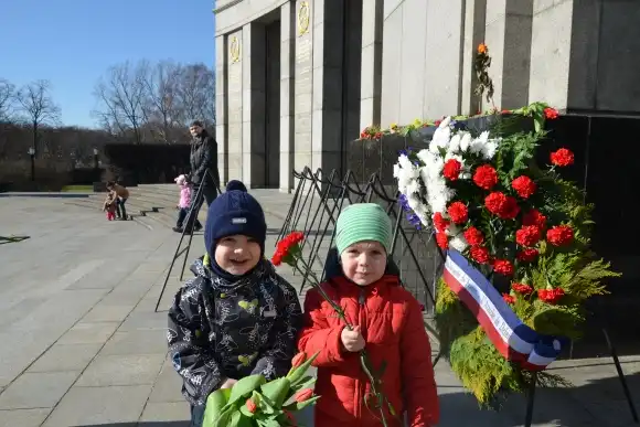 а затем центр торжеств переместился в Тиргартен к Памятнику павшим Советским солдатам. К - 12.00 площадь перед Памятником была полностью занята военными делегациями разных стран, ветеранами войны, детьми, просто людьми, хорошо осознающими роль и значение Защитника Отечества, как в истории, так и сегодня. Ярко-красные живые гвоздики на боевом танке - картинка, которая не может не взволновать и не вызвать серьёзных размышлений.