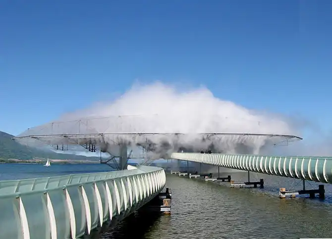 Дом-облако построили для швейцарской выставки в 2002 году. «Мы хотели сделать здание не просто на берегу озера, а из самого озера. Построили металлический каркас и с помощью сложной системы непрерывно создавали туман, водяное облако вокруг него. В итоге получилось огромное, бесформенное, постоянно меняющееся произведение архитектуры», — говорят авторы проекта Blur Building. Надев плащ или дождевик, можно зайти внутрь и побродить в тумане.