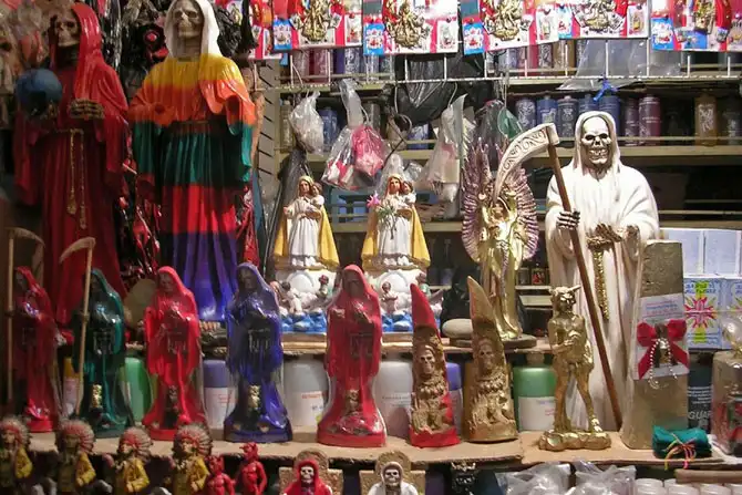 В течение всего года они продают ничем не примечательную сувенирную продукцию, но к торжествам местного религиозного культа Санте Муэрте рынок прямо-таки преображается: помимо благовоний, свечей и мыла (которое, как утверждает, может вылечить даже рак), местные целители продают лекарственные травы, масла, одинаково «успешно» помогающие сохранить брак или вылечить бесплодие, а также исчезающих видов животных – сов, павлинов и черных игуан.