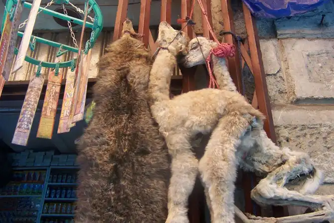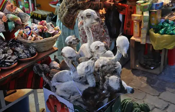 Особого внимания заслуживают мумифицированные останки животных или разделанные тушки зверьков, вроде высушенных жаб или летучих мышей, и, конечно же, зародышей лам – их продают от $2 за штуку. Здесь же, кстати, можно приобрести свежие листья коки, без которых местные оккультисты буквально жить не могут.