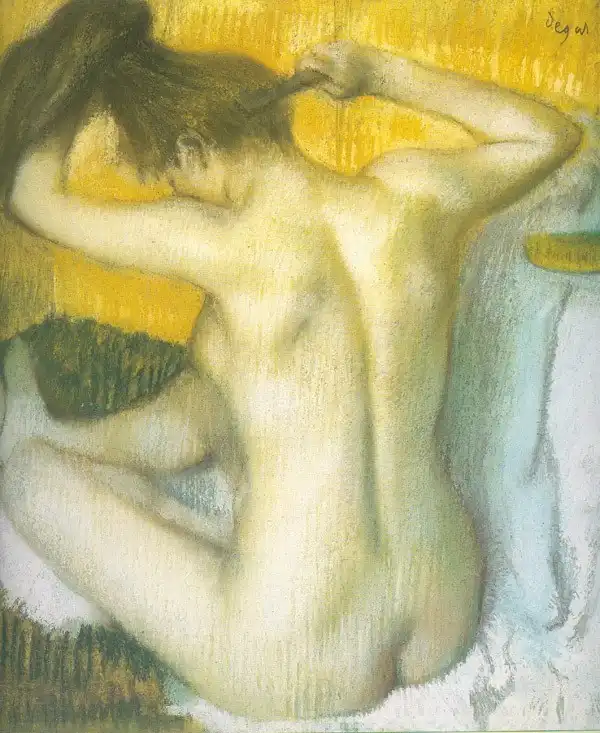В середине 1880-х гг. Э.Дега начинает использовать пастель. Причиной этому явился прогрессирующий конъюнктивит, которым художник заболел, находясь на военной службе в качестве добровольца при осаде Парижа. Именно в это время он создает свои знаменитые изображения обнаженной натуры. Преклонение перед человеческим телом он выразил в серии пастелей, представляющих женщин за туалетом ("После ванны", 1885, частное собрание), Эти восхитительные работы были показаны на восьмой, последней выставке импрессионистов в 1886 г.