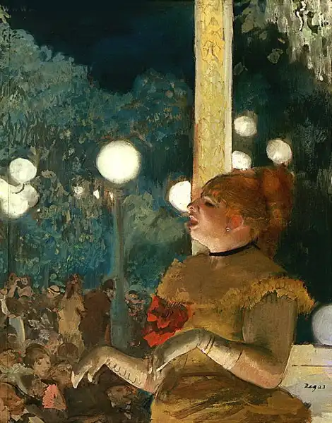В 1860-е гг., копируя старых мастеров в Лувре, Э.Дега знакомится с Э.Мане, с которым его сближает общее неприятие академического салонного искусства. Э.Дега больше интересовался современной жизнью во всех ее проявлениях, нежели вымученными сюжетами выставленных в Салоне картин. Не принимал он также и стремление импрессионистов работать на открытом воздухе, предпочитая мир театра, оперы и кафе-шантана. Придерживаясь достаточно консервативных взглядов как в области политики, так и в личной жизни, Э.Дега был чрезвычайно изобретателен в поисках новых мотивов своих картин, используя неожиданные ракурсы и укрупненные планы ("Мисс Лала в цирке Фернандо", 1879, Национальная галерея, Лондон).