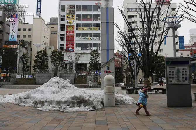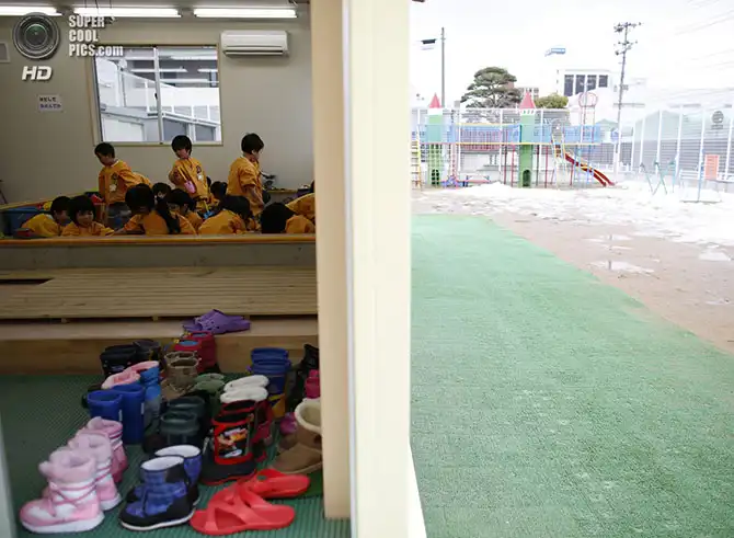 2-летняя Нао Ватанабе играет на крытой детской площадке. Ей, как и другим детям в возрасте до трёх лет, разрешают находиться на воздухе не больше 15 минут в день из опасений радиоактивного заражения.
