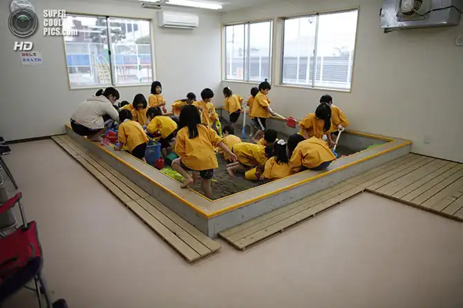 Дети играют в песке в игровой комнате детского сада «Эмпориум».