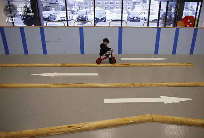4-летний Иори Хияма катается на трёхколёсном велосипеде на крытой детской площадке.