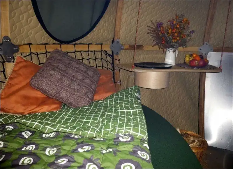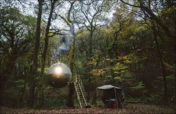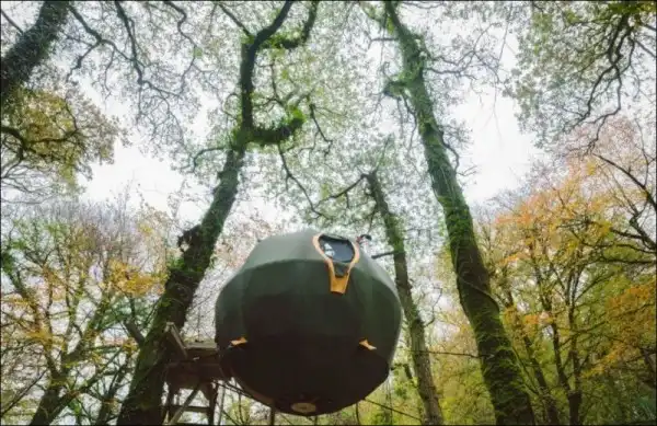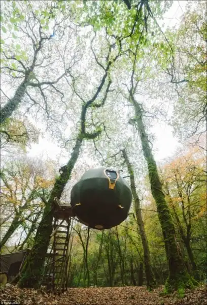 Необычная подвесная палатка-шар висит в лесу графства Корнуолл на юго-западе Англии. Она достаточно прочная и вмещает в себя два раздельных спальных места для двух взрослых людей. За возможность провести в ней ночь владелец просит ни много ни мало 95 фунтов (5 760 рублей).