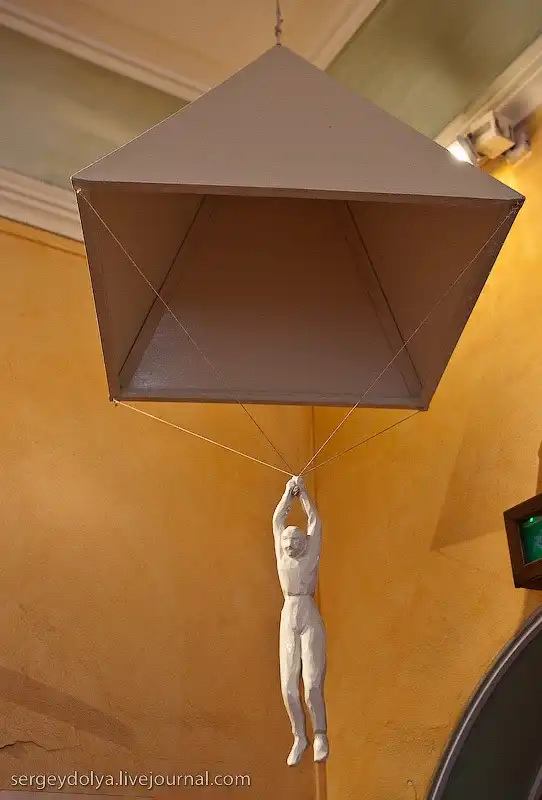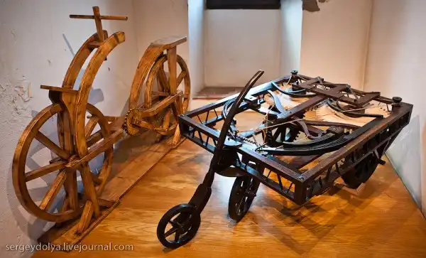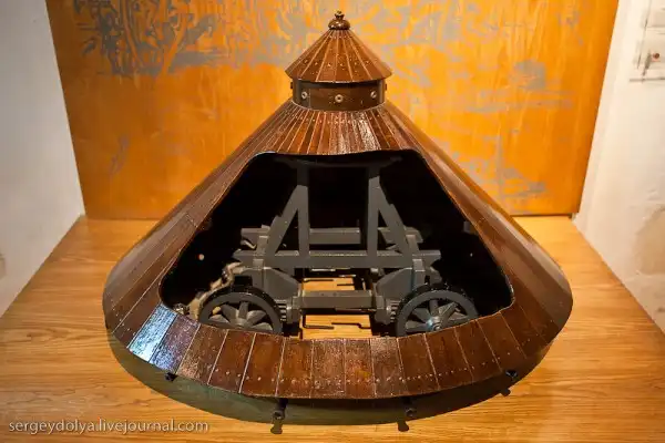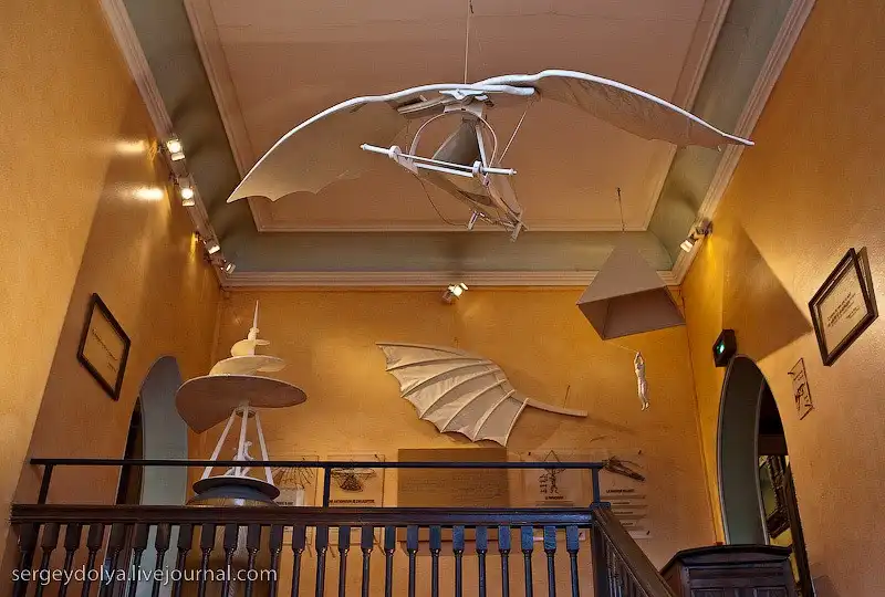 По всему дому расставлены макеты фантастических проектов Леонардо, здесь есть и прообраз вертолета, и парашюта, и пушки, и велосипеды, и даже танки: