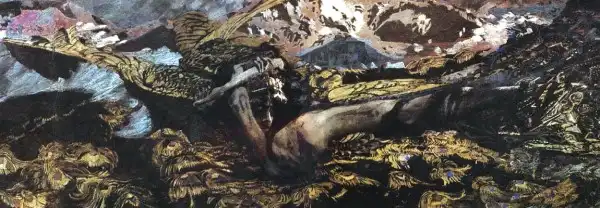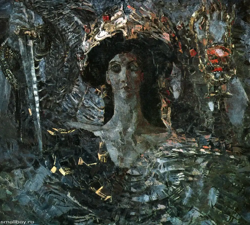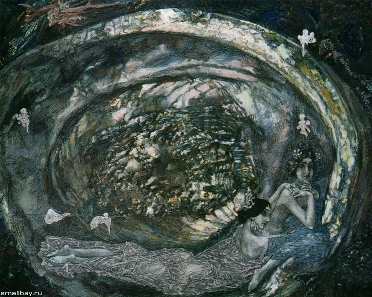 Атмосфера волшебной сказки, характерная для картин "Пан" (1899), "Царевна-Лебедь", "К ночи", "Сирень" (все 1900), пронизана характерным для символизма чувством темного хаоса, таящегося за внешними покровами мироздания. Экспрессивно-драматичны и портреты (К. Д. и М. И. Арцыбушевых, а также Саввы Мамонтова, все три 1897; все работы – в Третьяковской галерее). Подспудный трагизм достигает кульминации в тех врубелевских образах, которые восходят к его иллюстрациям к поэме Лермонтова "Демон", – в картинах "Демон" (1890) и "Демон поверженный". Конгломерат искрящихся форм в последней картине близок уже к беспредметному искусству.