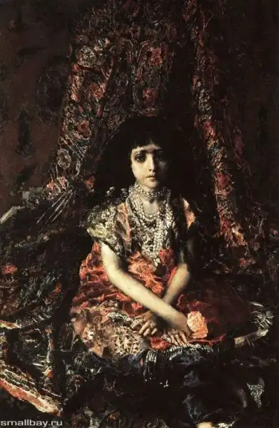 Приглашенный для реставрации Кирилловской церкви (12 век), Врубель в ряде случаев должен был исполнить новые композиции (в частности, "Сошествие Святого Духа", 1884); тогда же художник написал и икону "Богоматерь с младенцем". Византийская традиция насыщается здесь острым, трагически-напряженным психологизмом нового времени. Феерическое великолепие врубелевского колорита в полной мере проявилось в картине "Девочка на фоне персидского ковра" (1886).