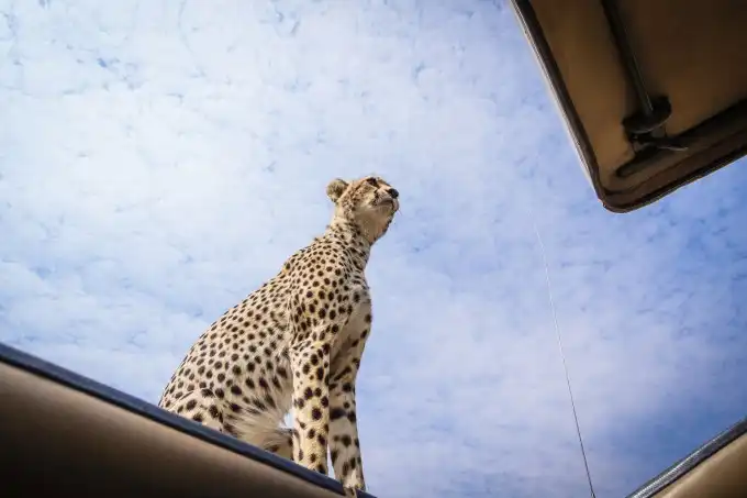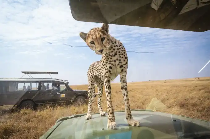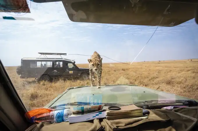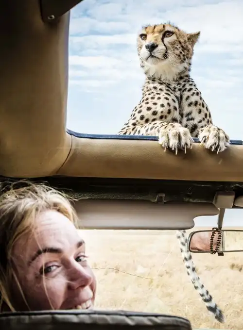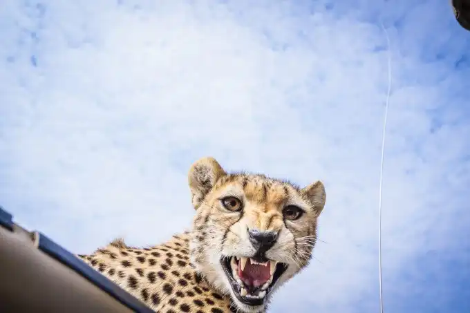 31-летний австралиец Бобби-Джо Клоу (Bobby-Jo Clow) отправился на фотоохоту в Национальный парк Серенгети (Танзания). Во время поездки молодой гепард вместе со своим братом или сестрой направился прямо к его автомобилю. Котенку стало интересно, что за мясо прячется в салоне автомобиля, поэтому он забрался на крышу, просунул голову через люк, который был открыт. Фотограф попытался сделать несколько кадров, на что гепард зашипел и обнажил свои клыки.