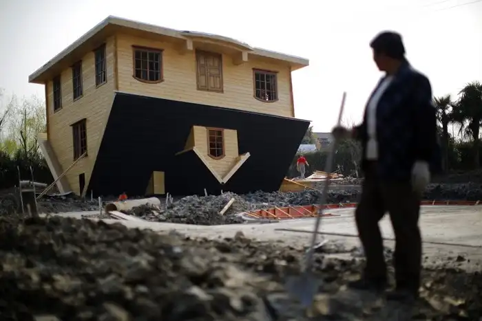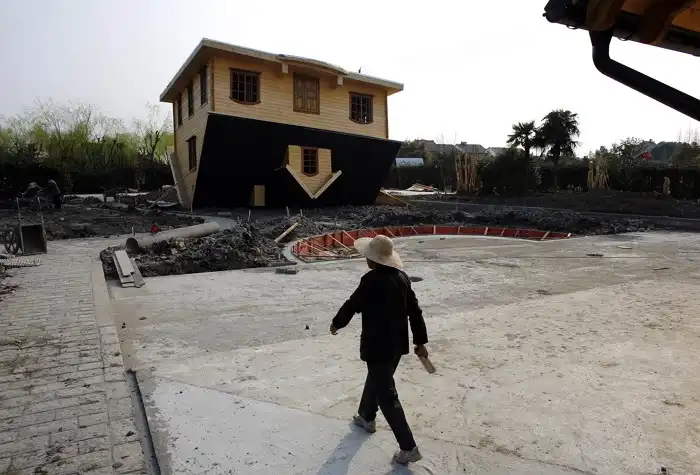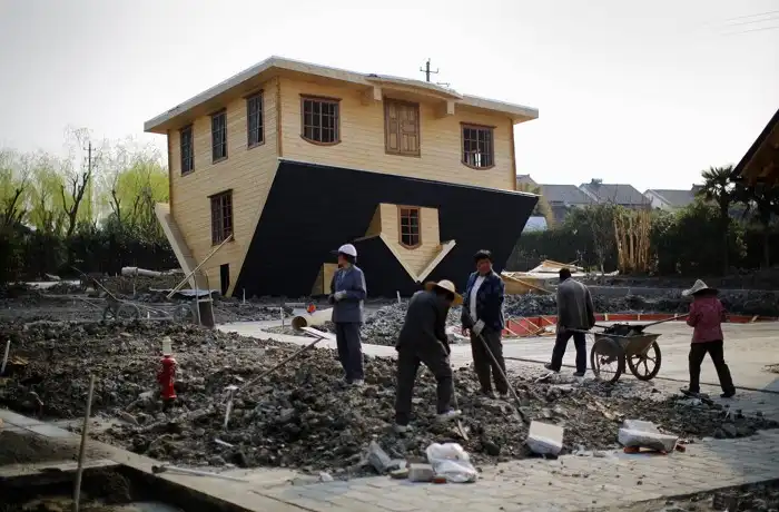 В древнем городе Фэнцзин, в районе Цзиньшань, к югу от Шанхая, строители построили эксцентрическую достопримечательность перевернутый дом. В апреле дом откроет двери для туристов.