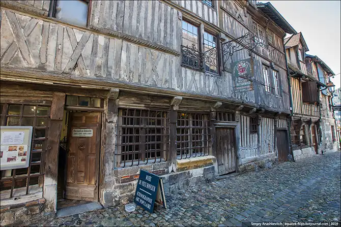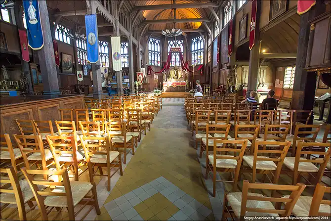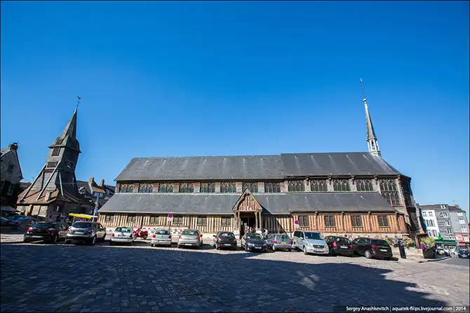 Это знаменитая церковь Святой Екатерины, самая большая деревянная церковь Франции. Построена она была в 15 веке, во время Столетней войны, местными мастерами-корабелами, а потому в ее облике прослеживается явное сходство с кораблем.