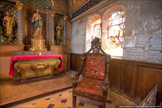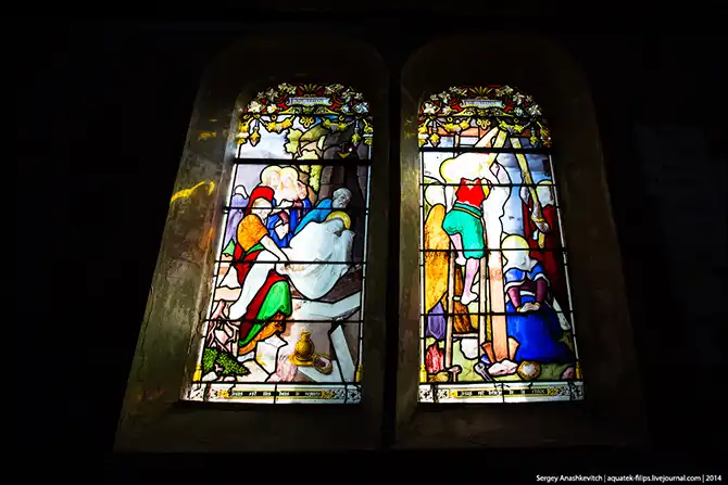 В церкви поразительные витражи на стеклах. Они мне показались даже более впечатляющими, чем фрески