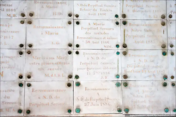 На табличках слова благодарности Деве Марии за помощь и выражение признательности по поводу исцеления и пр. Видимо, имеет отношение к пожертвованиям.
