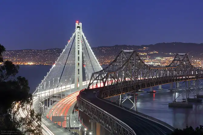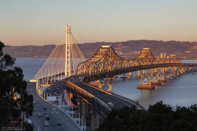 Северная часть Бэй бриджа, соединяющая остров Йерба Буэна и Окленд. Подвесной мост — новый, которым пользуются сейчас. Старый (справа) — двухэтажный, по нему сейчас не ездят: