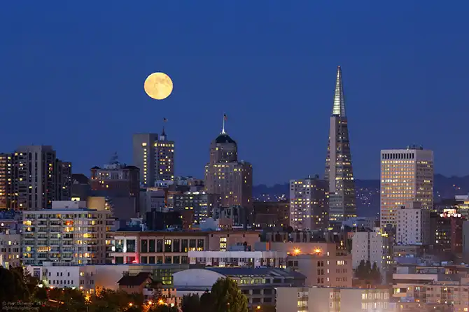 Вид с площади Аламо на Даунтаун. Встает луна. Но так снимают редко…