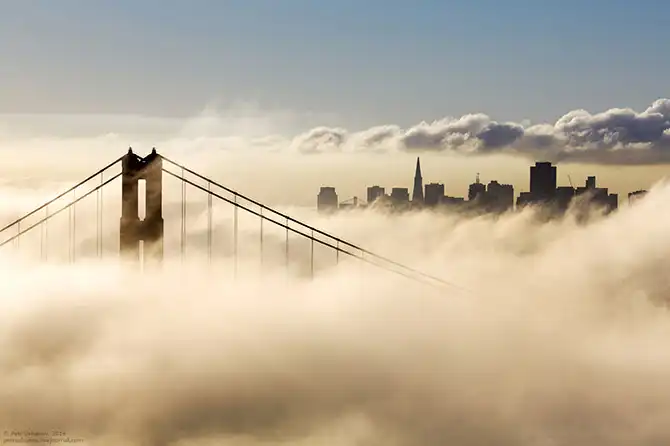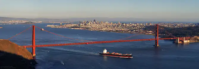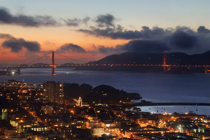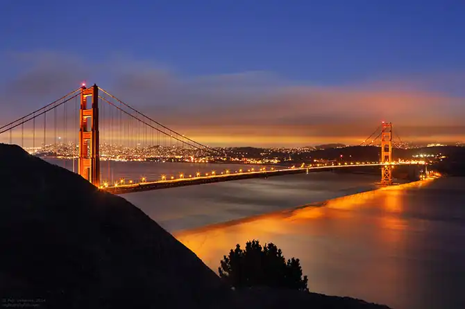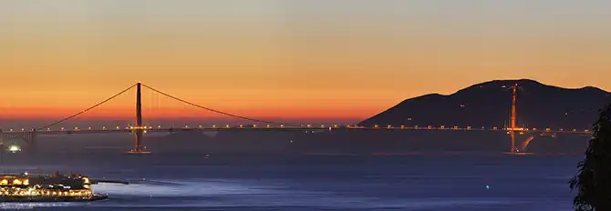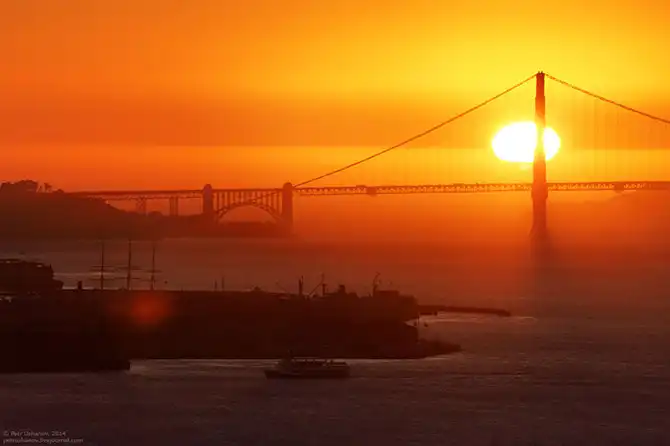 Если смотреть в конце сентября с острова Йерба Буэна, то солнце садится прямо за южным пилоном моста Золотые Ворота: