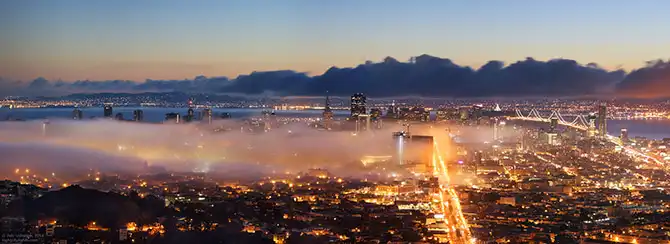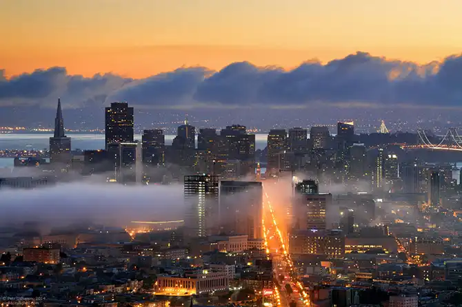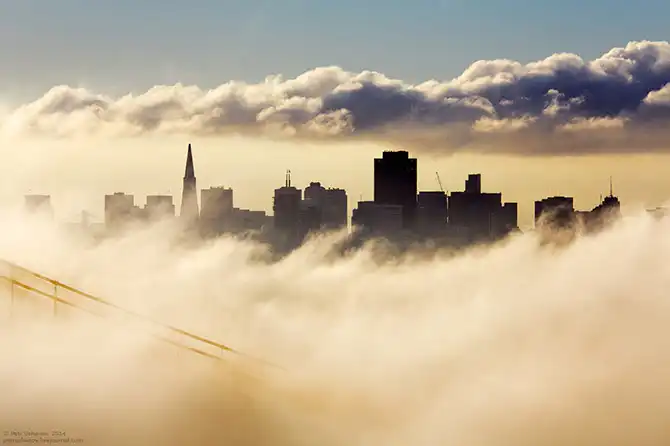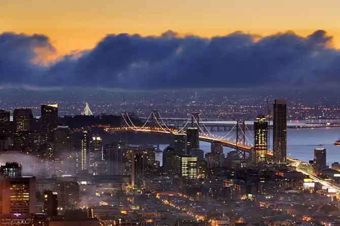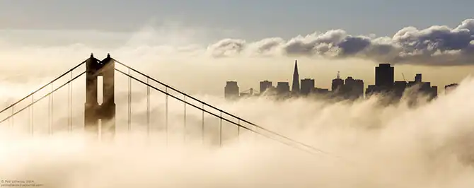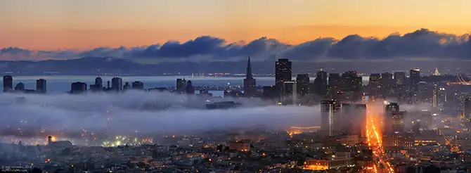 Мосты «Золотые ворота», Бэй Бридж (вдали слева) и центр города (вдали справа) в рассветном тумане: