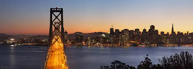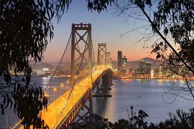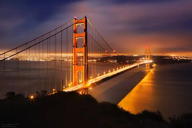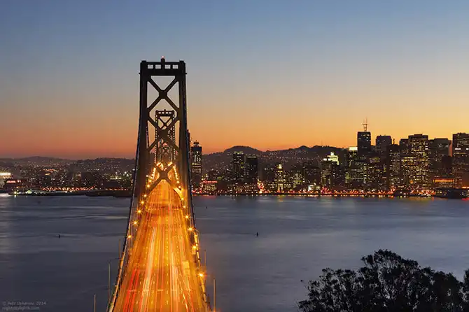 Еще одна классика. Южная часть Бэй Бридж, соединяющая Сан-Франциско с островом Йерба Буэна. Мы видим только красные трассеры от машин, ибо мост двухэтажный, а по верхнему ярусу едут в Даунтаун: