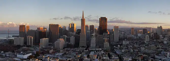 Панорама центра Сан-Франциско. Вдали слева — мост Бэй Бридж.