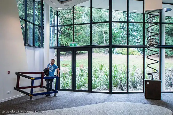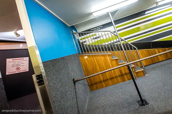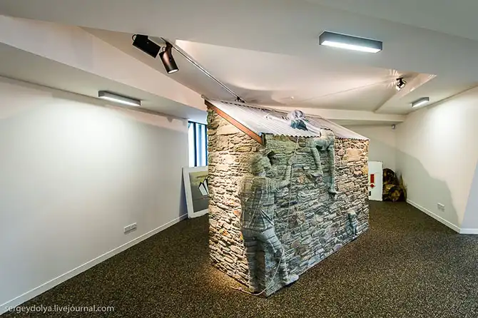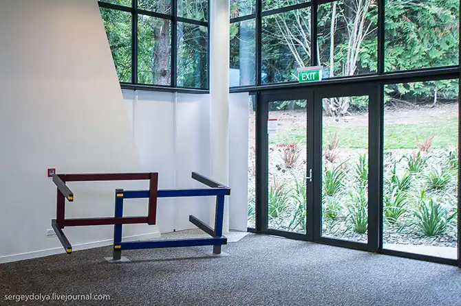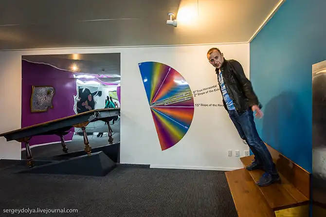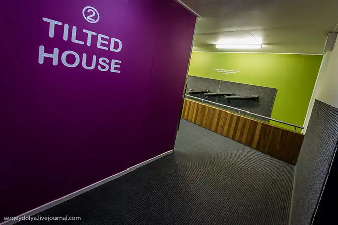 Всё внутри этого дома находится под углом в 15 градусов. За счет этого возникает впечатление, что центр силы тяжести смещен вбок. Обратите внимание на объявление слева на стене – оно еще в «нормальном мире», а не в наклоненном: