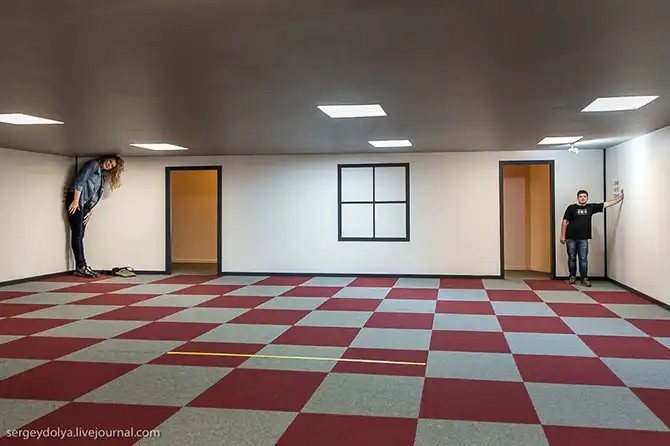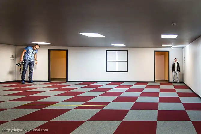 Еще одна крутая штука. Кажется, стена напротив стоит перпендикулярно, но на самом деле она расположена наискосок. Эффект достигается из-за определенной раскраски и наклона пола, который имитирует квадраты. «Окно» тоже не квадратное: