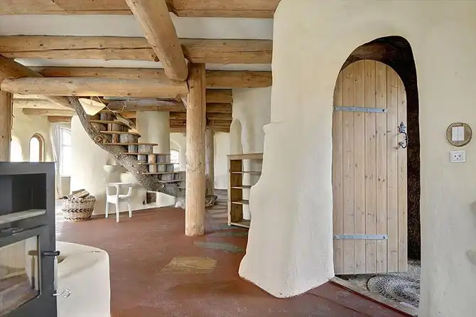 Наверху большая комната с дровяной печью — спальня.