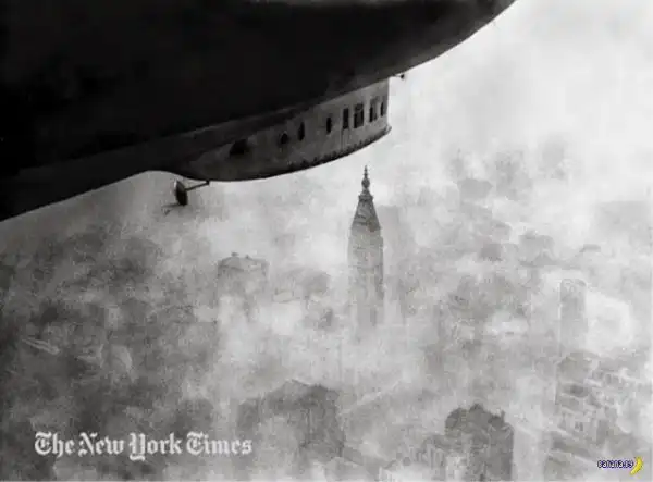 Редкое фото: дирижабль пристыковался к небоскребу еще до того, как площадка была достроена.