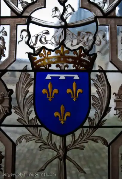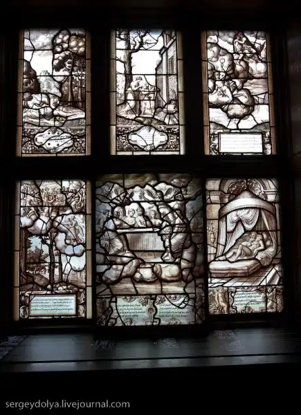 Окна украшены гербами и витражами: