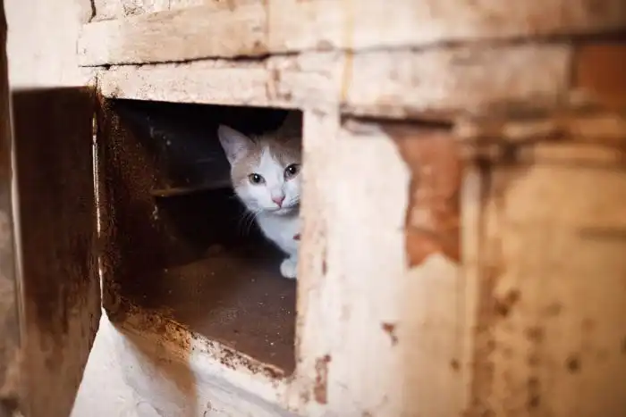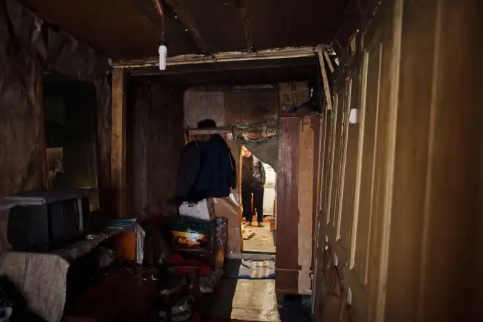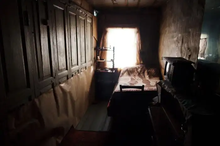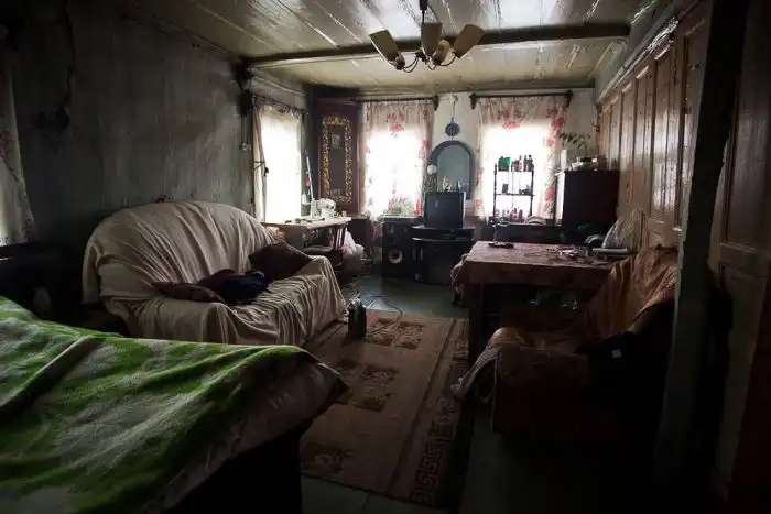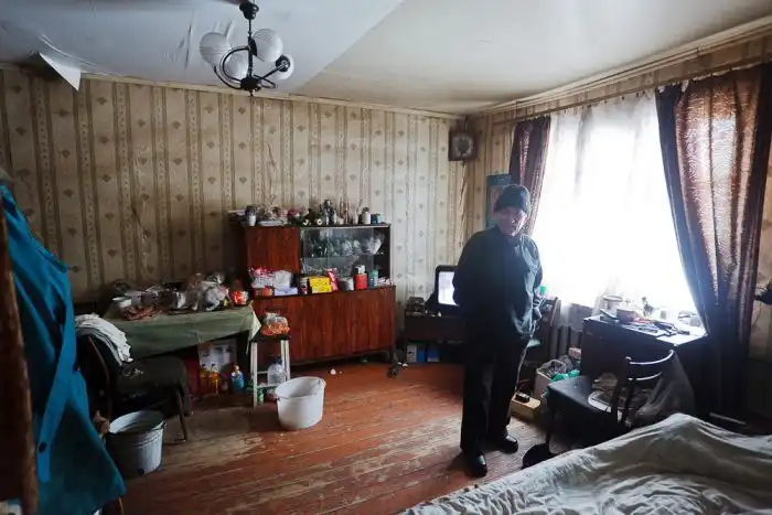 Стены под углами в разные стороны. Везде свисают куски обоев. Хорошо хоть потолок пока не протекает.