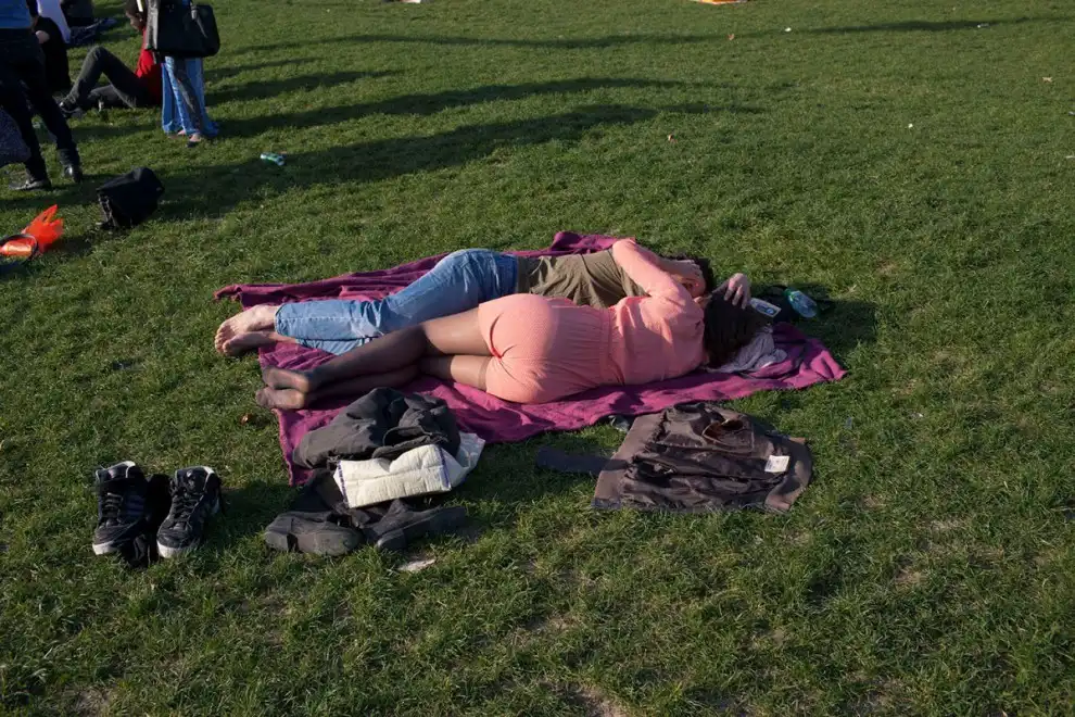 Влюблённые целуются на траве возле Эйфелевой башни, 20 марта 2014 года.