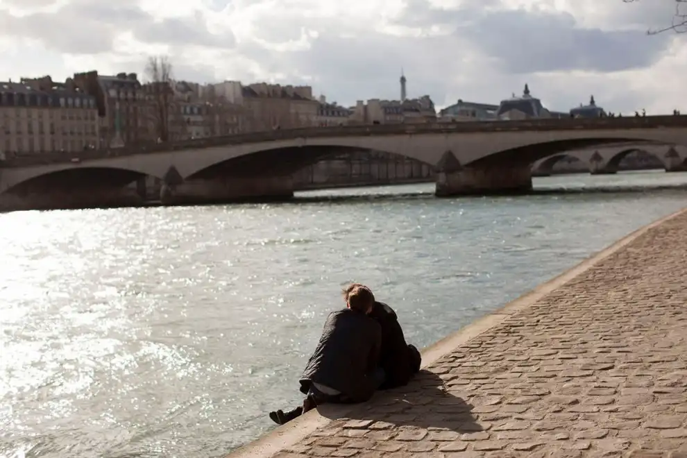 Влюблённые целуются на берегу Сены, 22 марта 2014 года.