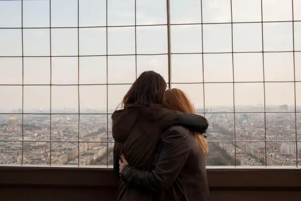 Женщины обнимаются на вершине Эйфелевой башни, 26 марта 2014 года.
